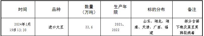 受中储粮油脂有限公司委托,2024年3月19日13:30在国家粮食和物资储备局粮食交易协调中心及联网的各省(区、市)湖北粮网组织开展进口大豆竞价交易,请交易会员通过湖北粮网官网()“用户中心”,登录国家粮食交易平台,在专场列表中选择“进口大豆竞价销售交易”参与交易。现就有关事项公告如下(重点提示内容详见加粗字体部分):