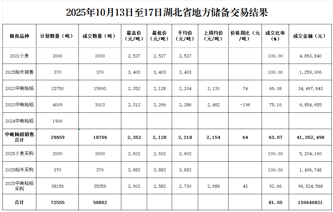本周湖北地储成交各类粮油58802吨。其中销售:2021年小麦2000吨,成交率100%,成交均价2527元/吨;2025年籼米370吨,成交率100%,成交均价3403元/吨;2022年中晚籼稻15693吨,成交率66.08%,成交均价2204元/吨,环比上涨74元/吨;2023年中晚籼稻3013吨,成交率75.16%,成交均价2286元/吨,环比下跌196元/吨。采购:2025年小麦2000吨,成交量100%,成交价格2602元/吨;2025年籼米370元/吨,成交率100%,成交均价3883元/吨;2025年中晚籼稻35356吨,成交率92.66%,成交均价2730元/吨,环比上涨42元/吨。